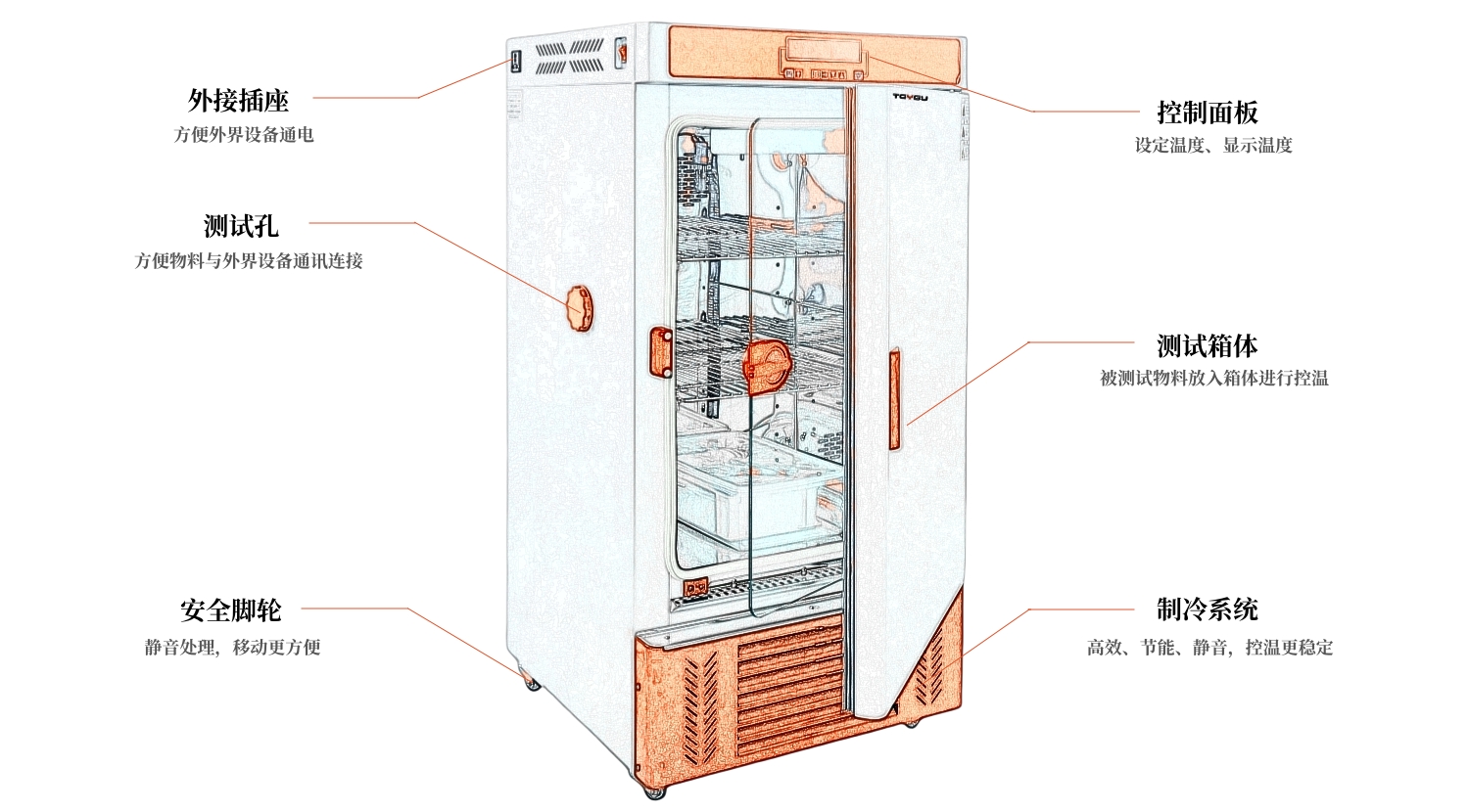 ∎箱體采用優質鋼板制作而成,表面噴塑,內膽采用鏡面不銹鋼,四角半圓弧,易清潔,箱內擱板間距可調,外門帶有觀察窗或鋼化內玻璃雙層門。